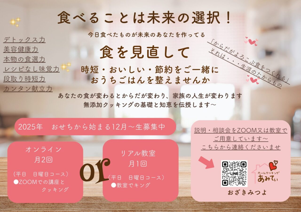 食のアカデミー💛年間講座 12月おせちから始まる受講生募集開始 公開日:2025/05/26 更新日:2025/09/30 春夏秋冬 一年間通じて学び愛のクッキング、楽しみませんか 12月生募集中! 食を見直したい方、手料理を身につけたい子育てママ、ママを応援したいお母さん 先ずは、ゆっくりお話しタイムをご一緒に。